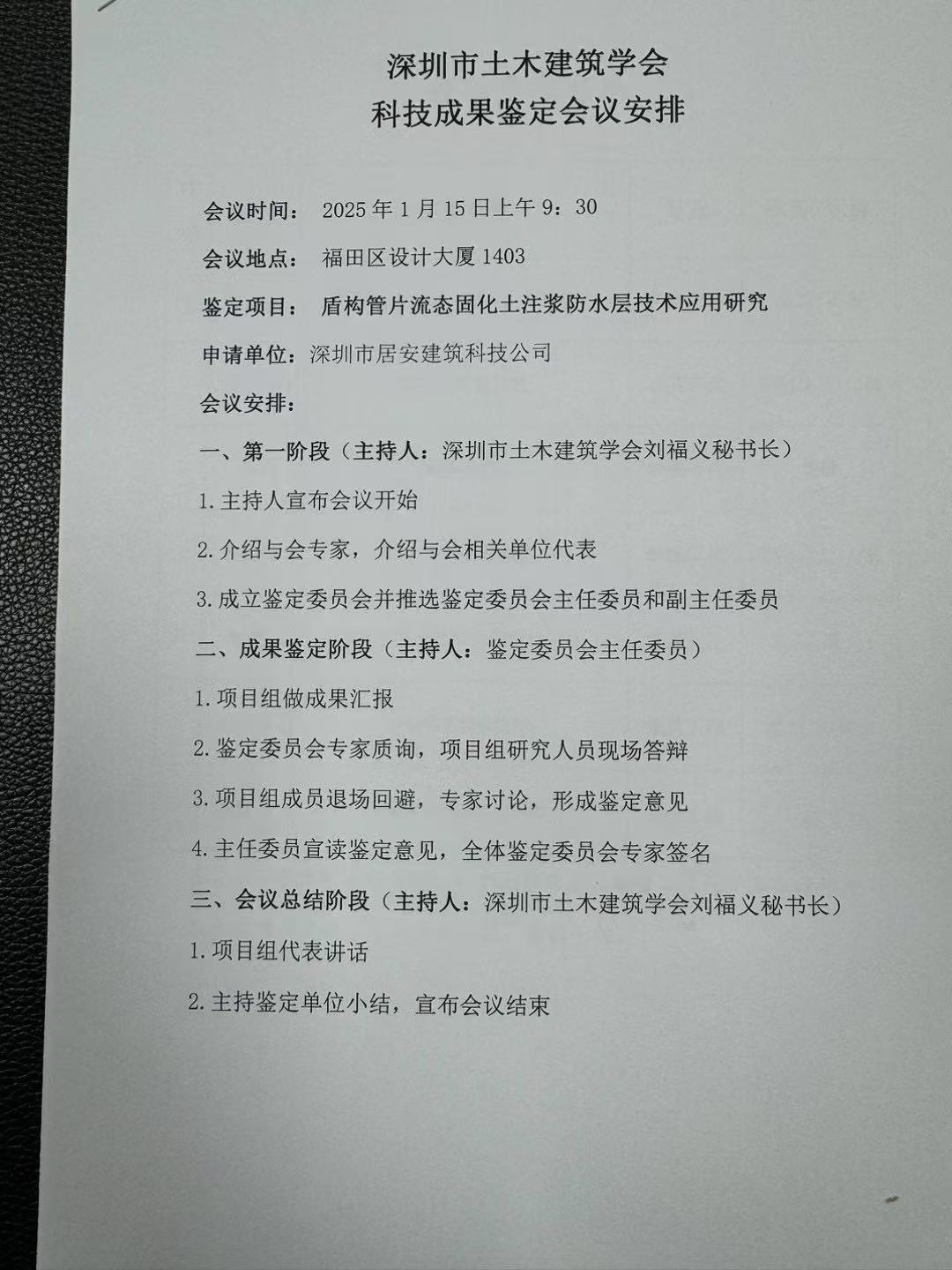 2025-1-15。深圳市居安建筑科技公司的科技成果鉴定会在设计大厦举行。会议由刘福义秘书长主持,科技成果获得较高评价。