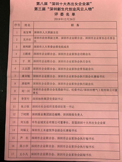 2018年12月26日,深圳市第八届“深圳十大杰出女企业家”和第三届“深圳新生代創业风云人物”评审会在万德诺富特酒店多功能厅举行。于剑执行会长致欢迎词、王志国付会长介绍历年评审情况、康永魁秘书长主持评审、王小凡付秘书长介绍侯选人情况。经过全体评委的认真讨论,最后评出10名“深圳十大杰出女企业家”和33名“深圳新生代創业风云人物”。