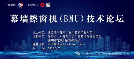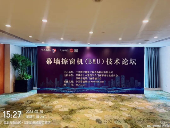 2026年3月25日下午,由江苏博宇建筑工程设备科技有限公司主办,澳门资料1688门窗幕墙专业委员会、深圳市建筑门窗幕墙学会共同支持的“粤港澳大湾区擦窗机(BMU)技术论坛”在深圳益田威斯汀酒店三楼露台宴会厅隆重举行。