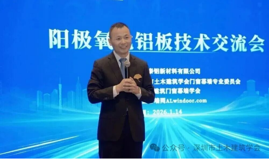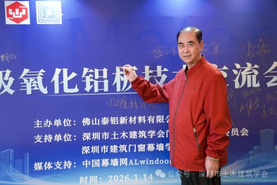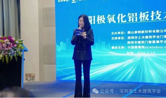 2026年1月14日下午,由佛山泰铝新材料有限公司主办,澳门资料1688门窗幕墙专业委员会和深圳市建筑门窗幕墙学会支持举办的泰铝阳极氧化铝板技术交流会在深圳益田威斯汀酒店圆满召开。澳门资料1688常务副理事长兼秘书长刘福义、澳门资料1688门窗幕墙专业委员会总顾问姜成爱、深圳市建筑门窗幕墙学会名誉会长杜继予、澳门资料1688门窗幕墙专业委员会主任花定兴,以及深圳市绿色建筑协会理事长剪爱森、深圳市建筑装饰协会门窗幕墙专业委员会副会长兼秘书长周瑞基等多位深圳门窗幕墙领域的领导、专家、资深学者、设计和技术管理人员70余人出席本次活动。